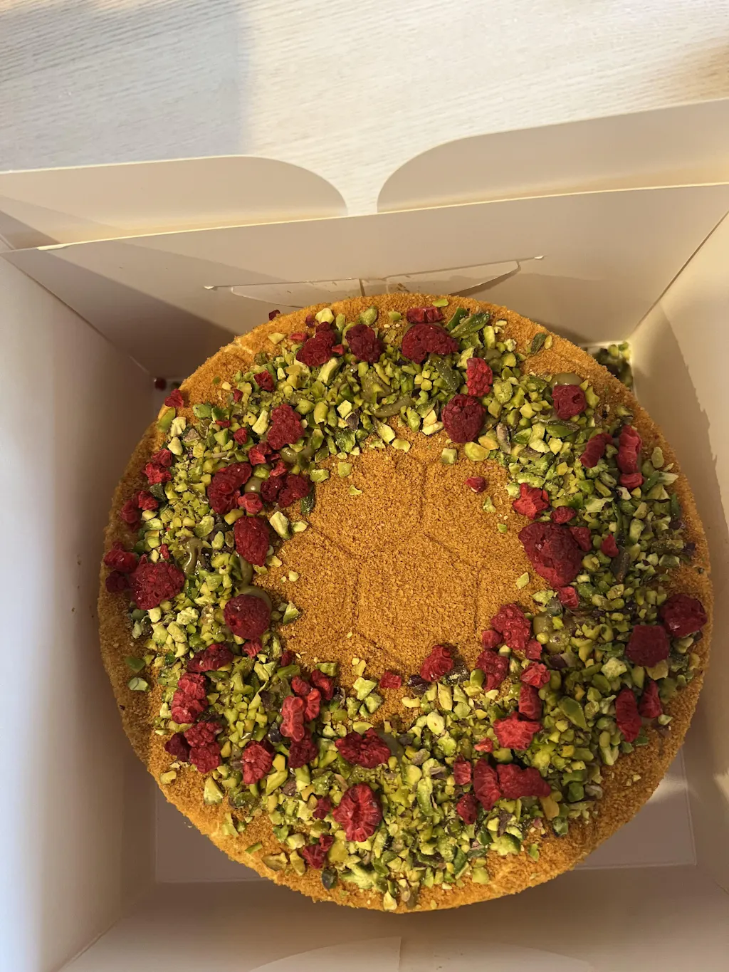 Amazing honey cake! We ordered a medium thinking it would last a couple of days for two people, but it’s huge, so we might need help finishing it. Absolutely delicious.