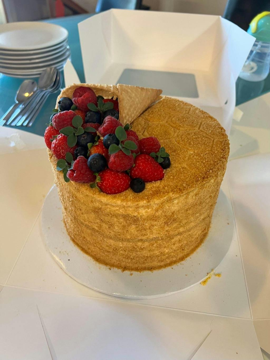 This cake was truly amazing and has been a smash hit whenever we’ve served it to guests! It’s a wonderful balance of lightness and density and the honey flavour really shines through. I’ve found it’s popular with young and old alike (which can really be a challenge with desserts sometimes!) Visually it’s also very impressive! I’d highly recommend it and will gladly order more again for the next family celebration we have.